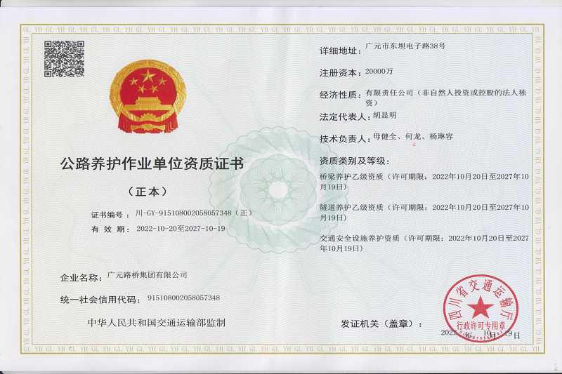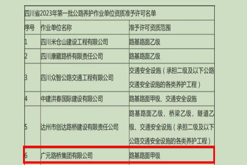 再添喜報!2023年2月16日,四川省交通運(yùn)輸廳官網(wǎng)公布了《四川省2023年第一批公路養(yǎng)護(hù)作業(yè)單位資質(zhì)準(zhǔn)予許可名單》,廣元路橋集團(tuán)有限公司位列其中。至此,廣元路橋集團(tuán)有限公司成功獲得路基路面甲級、橋梁乙級、交通安全設(shè)施、隧道乙級4項(xiàng)公路養(yǎng)護(hù)作業(yè)資質(zhì),成為我市第一家、也是唯一一家取得上述公路養(yǎng)護(hù)作業(yè)資質(zhì)的市屬國有企業(yè)。