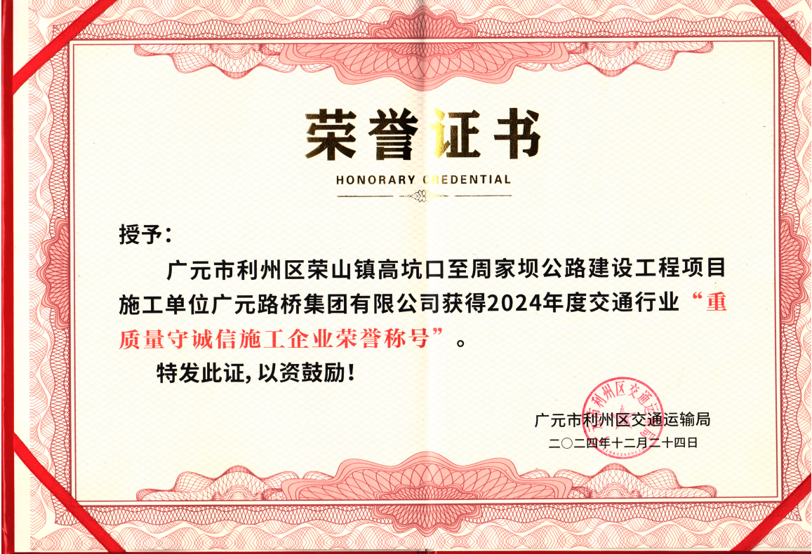 2024年12月24日,路橋集團受到利州區(qū)交通運輸局表揚,榮獲“2024年度交通行業(yè)重質(zhì)量守誠信施工企業(yè)”榮譽稱號,路橋集團榮山鎮(zhèn)高坑口至周家壩項目部在工程建設(shè)全過程中,始終以認真細致、嚴謹高效的工作態(tài)度完成各項施工任務(wù),以實際行動詮釋“重質(zhì)量、守誠信”的精神內(nèi)涵。