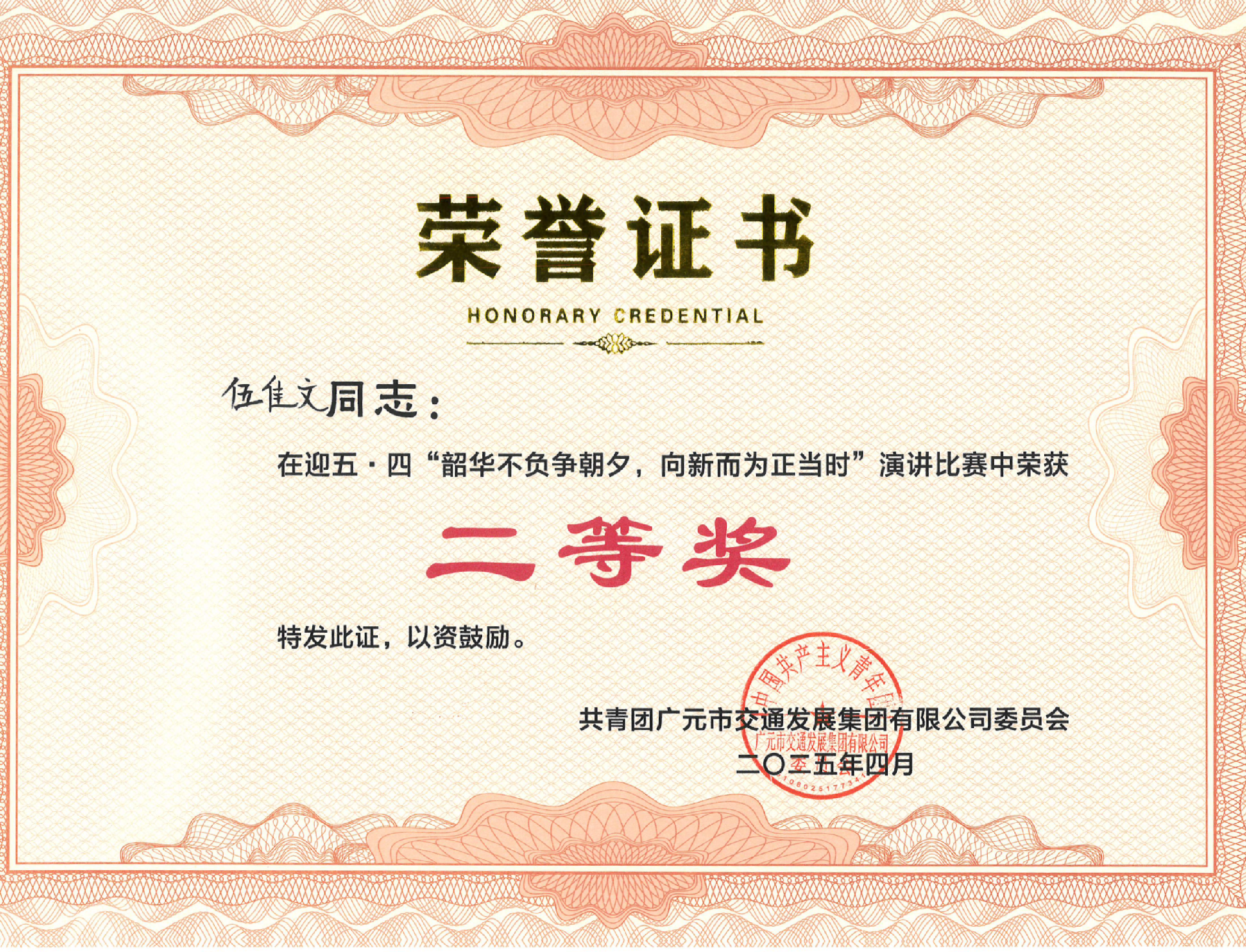 憑借極具感染力的舞臺表現(xiàn)和真摯動人的內(nèi)容表達(dá),伍佳文同志從眾多選手中脫穎而出,榮獲二等獎佳績。